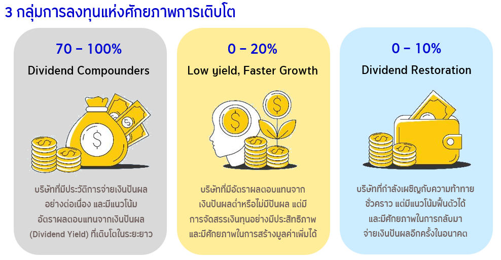 - ใช้กลยุทธ์ที่ออกแบบเพื่อให้เงินปันผลจากการลงทุนเป็นตัวขับเคลื่อนผลตอบแทน เน้นลงทุนในบริษัทที่มีศักยภาพสร้างการเติบโตของเงินปันผลอย่างต่อเนื่องในระยะยาว ซึ่งคิดเป็นสัดส่วนมากกว่า 70% ของพอร์ตการลงทุนทั้งหมด