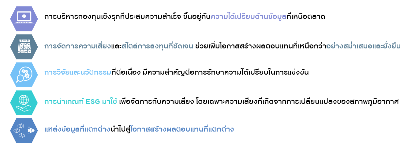 1. สร้างโอกาสรับผลตอบแทนที่เหนือกว่าด้วยความได้เปรียบด้านข้อมูลเชิงลึก จากการรวบรวมข้อมูลจากหลากหลายแหล่ง และการวิเคราะห์ประมวลผลขั้นสูงตั้งแต่เริ่มต้นในการจัดการกับข้อมูลดิบ เช่น การใช้ Machine Learning ทำให้เกิดมุมมองการลงทุนที่หลากหลาย นำไปสู่การสร้างพอร์ตเชิงรุกที่โดดเด่นและแตกต่าง