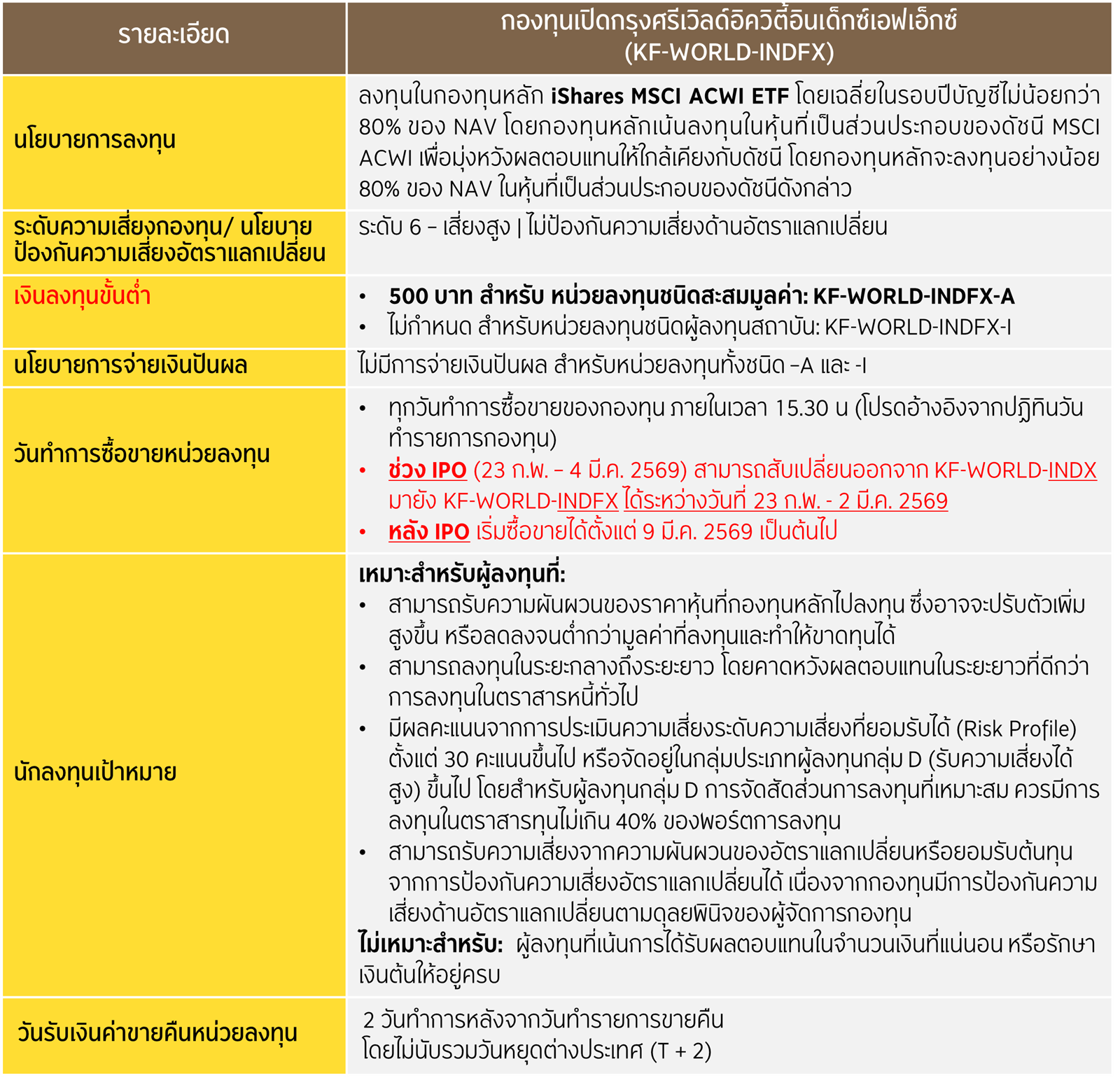 รายละเอียดกองทุนใหม่: KF-WORLD-INDFX