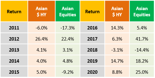 ที่มา: BlackRock ณ 31 มี.ค. 64 เปรียบเทียบ Asian USD high yield bonds อ้างอิงจากดัชนี ICE BofAML Asian Dollar High Yield Corporate Constrained Index กับ Asian Equities อ้างอิงจากดัชนี MSCI Asia ex-Japan Index