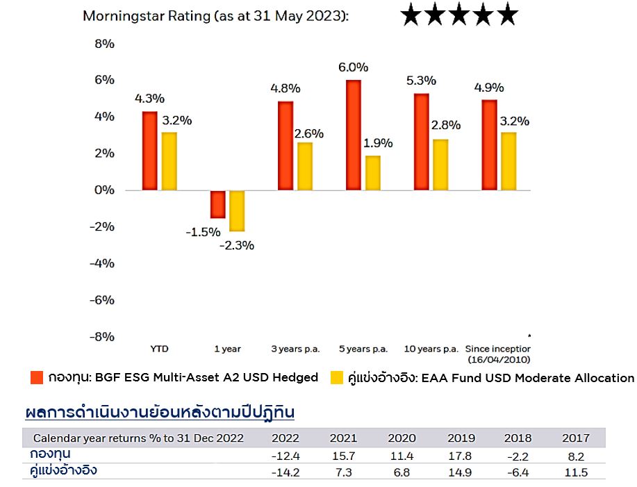 *ที่มา: BlackRock ณ 31 พ.ค. 66 โดยการจัดอันดับดังกล่าวไม่มีความเกี่ยวข้องกับการจัดอันดับของสมาคมบริษัทจัดการลงทุนแต่อย่างใดกลยุทธ์ของกองทุนหลัก BGF ESG Multi-Asset Fund