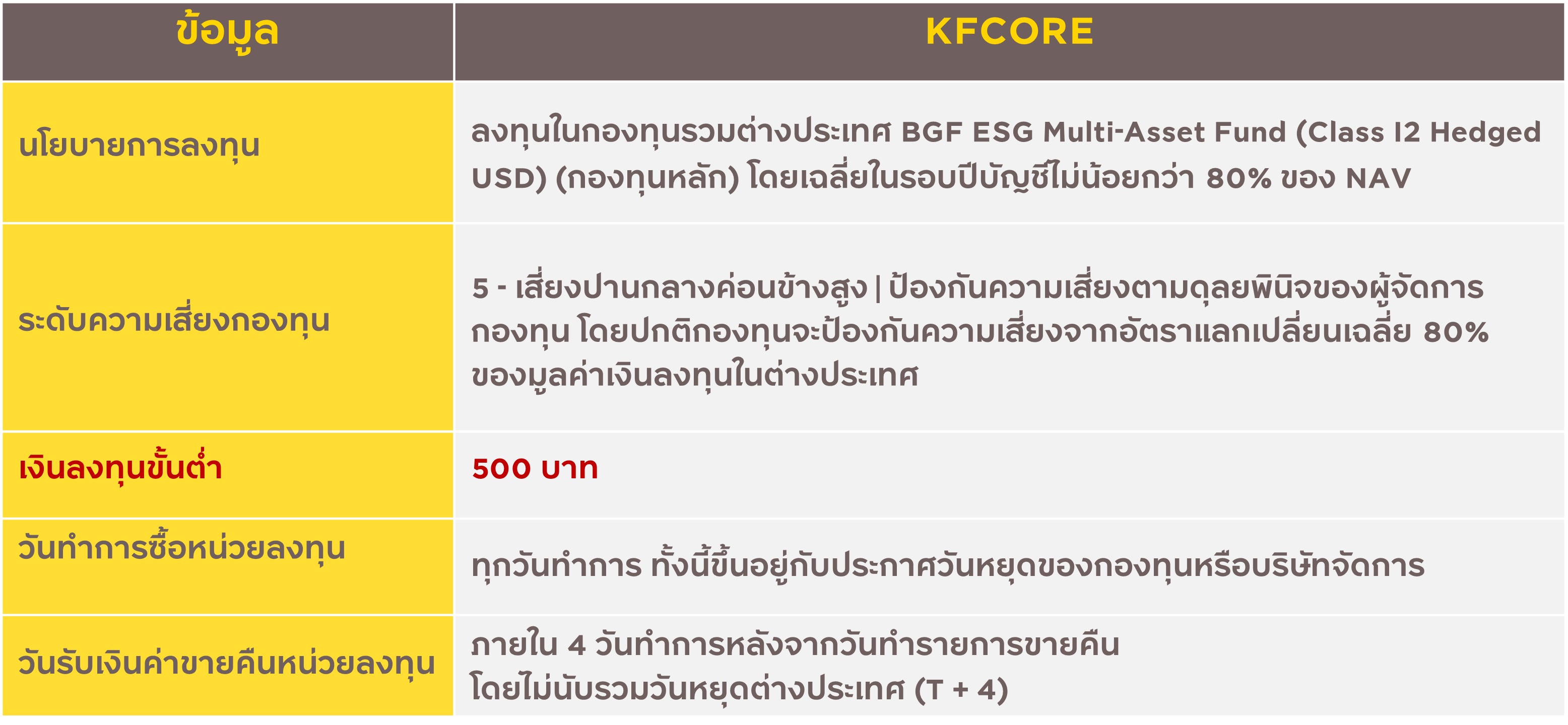 KFCORE ลงทุนในกองทุนหลัก BGF ESG Multi-Asset Fund กองทุนชั้นนำระดับ 5 ดาวจาก Morningstar* ซึ่งมีการกระจายการลงทุนในสินทรัพย์ต่างๆทั่วโลก ทั้งในตลาดหุ้นของประเทศพัฒนาแล้ว ตราสารหนี้ภาคเอกชน และสินทรัพย์ทางเลือก ด้วยการจัดการพอร์ตเชิงรุกและยืดหยุ่น โดยมีเป้าหมายเพื่อคว้าโอกาสการลงทุนและก้าวข้ามอุปสรรคต่างๆ ท่ามกลางภาวะตลาดที่มีความหลากหลาย โดยให้ความสำคัญกับปัจจัยด้าน ESG เพื่อสร้างความยั่งยืนให้กับผลการดำเนินงานควบคู่ไปกับโลกที่ดี