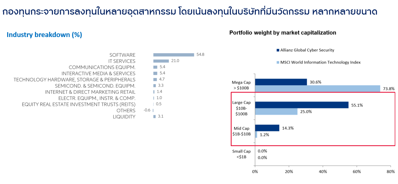 2. พอร์ตการลงทุนที่เน้นการลงทุนในบริษัทที่มีรายได้หลักจากด้าน Cyber Security โดยตรง พร้อมกระจายการลงทุนในหุ้นหลากหลายขนาดและกลุ่มอุตสาหกรรม เพื่อเข้าถึงโอกาสเติบโตของธุรกิจในกลุ่ม Cyber Security