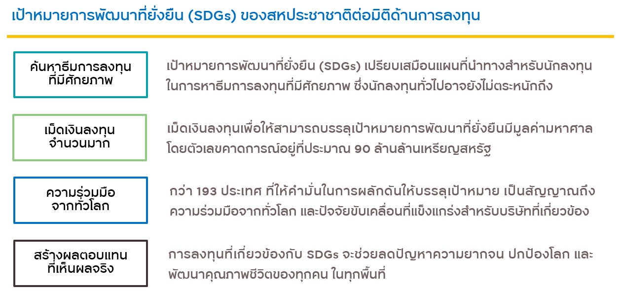 17 เป้าหมายการพัฒนาที่ยั่งยืน (SDGs) ของสหประชาชาติ สร้างธีมการลงทุนแห่งอนาคตที่จะทำให้ธุรกิจที่เกี่ยวข้องกับการพัฒนาเหล่านี้มีโอกาสเติบโตที่ยั่งยืนได้ในระยะยาว ด้วยการสนับสนุนจากนานาประเทศทั่วโลก พร้อมเม็ดเงินลงทุนมหาศาล