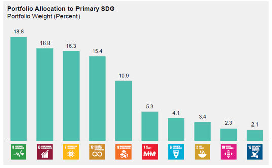 ที่มา: MSCI, UN และ AB ณ มิ.ย. 64 | บางผลิตภัณฑ์อาจมีความเกี่ยวข้องกับหลาย SDGs จึงทำให้การจัดประเภทอาจทำได้ยาก ดังนั้น ทีมผู้จัดการกองทุนจะเลือกพิจารณาจัดกลุ่มผลิตภัณฑ์ในกลุ่มนี้นี้ให้อยู่ใน SDG เพียงข้อเดียว | แต่ละ SDG จะมีเป้าหมายเฉพาะเจาะจงเพื่อช่วยประเมินความคืบหน้าและความสำเร็จของทั้ง 17 เป้าหมาย โดยพอร์ตการลงทุนถูกออกแบบให้มีสัดส่วนในโอกาสการลงทุนที่น่าดึงดูดมากที่สุด | ผลรวมอาจไม่เท่ากับ 100% เนื่องจากสัดส่วนการถือครองเงินสด