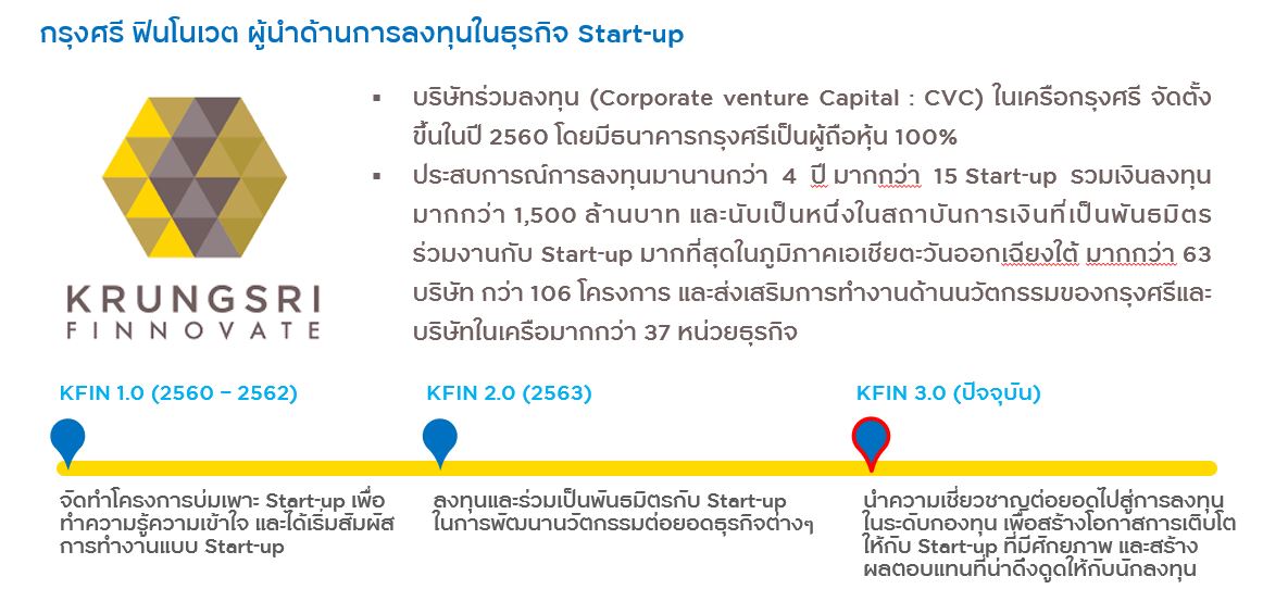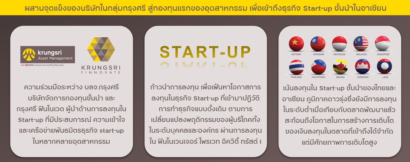 ผสานจุดแข็งของบริษัทในกลุ่มกรุงศรีเพื่อเข้าถึงธุรกิจ Start-up ชั้นนำในอาเซียน ผ่าน Finnoventure Private Equity Trust I กองทุนสตาร์ทอัพแรกของไทย บริหารโดย Krungsri Finnovate บริษัทร่วมลงทุนในเครือธนาคารกรุงศรีและผู้นำด้านการสนับสนุนและลงทุนในธุรกิจ Start-up ทั้งในระดับประเทศและภูมิภาค