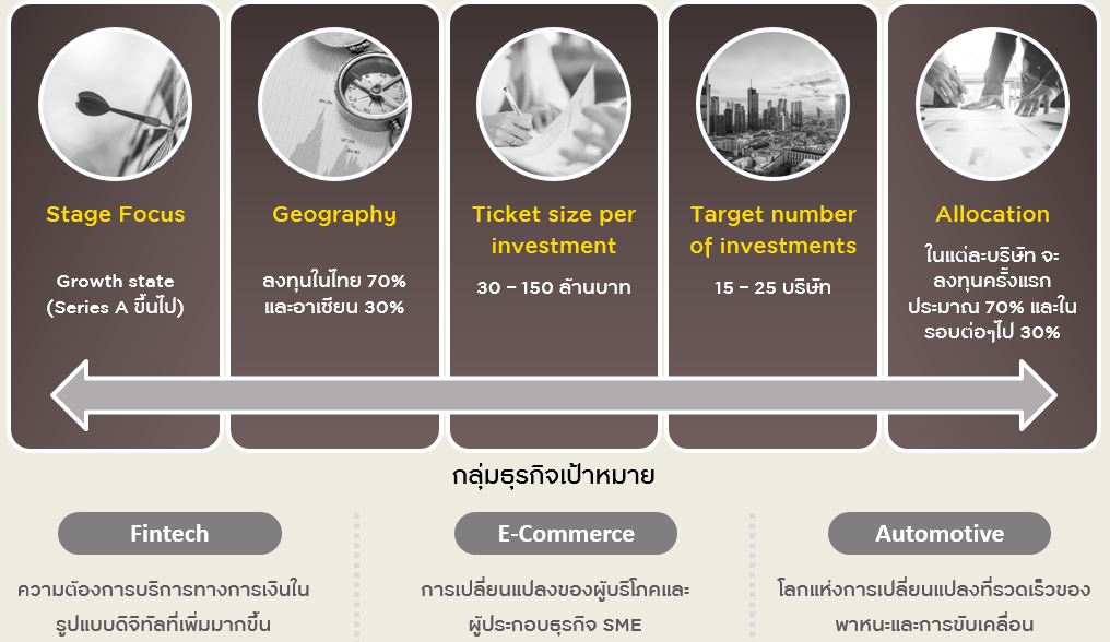 - ธีมการลงทุนหลัก: จะมุ่งเน้นลงทุนในธุรกิจที่มีโอกาสต่อยอดร่วมกับพันธมิตรของกรุงศรี เพื่อเสริมความแข็งแกร่งและการเติบโตของธุรกิจ Start-up ในอนาคต (Synergy Investment) นำมาซึ่งโอกาสของบผลตอบแทนที่จะได้รับจากการเติบโตและผลการดำเนินงานของธุรกิจเหล่านั้นเช่นกัน
