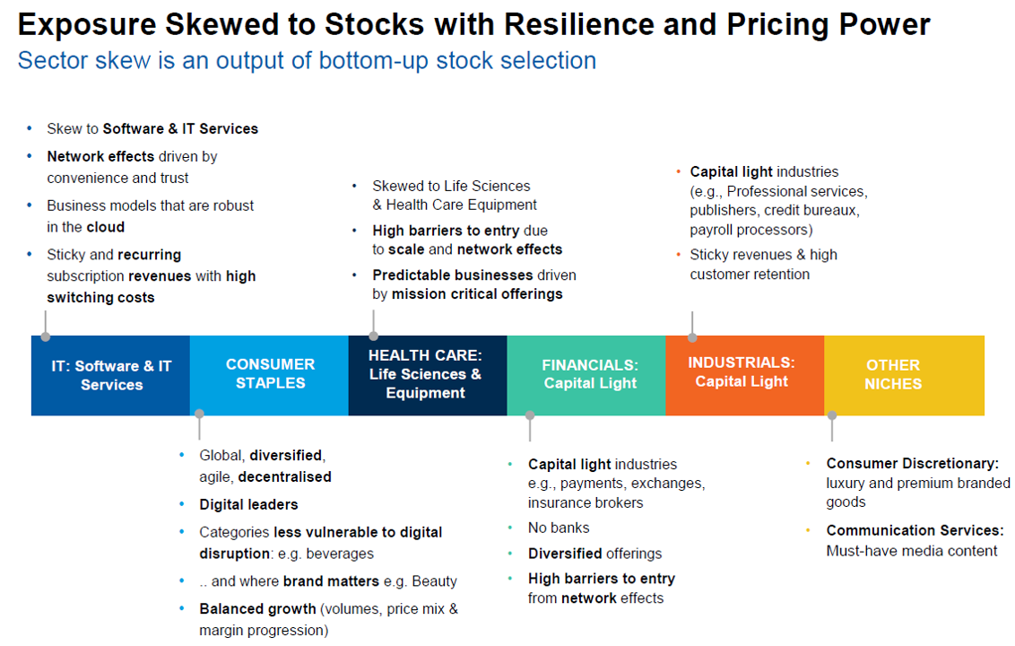 - ลงทุนในบริษัทที่มีรายได้สม่ำเสมอ เป็นแบรนด์สินค้าที่มี Brand Loyalty สูง ซึ่งลูกค้าเชื่อมั่นและใช้ในชีวิตประจำวันอย่างต่อเนื่อง ทำให้แบรนด์เหล่านี้มีความได้เปรียบทางการแข่งขันและมีอำนาจในการตั้งราคาได้สูง ได้แก่ กลุ่มสินค้าอุปโภคบริโภค กลุ่มสุขภาพ และเทคโนโลยี ซึ่งเป็น 3 กลุ่มสินค้าหลักที่กองทุนเน้นลงทุน