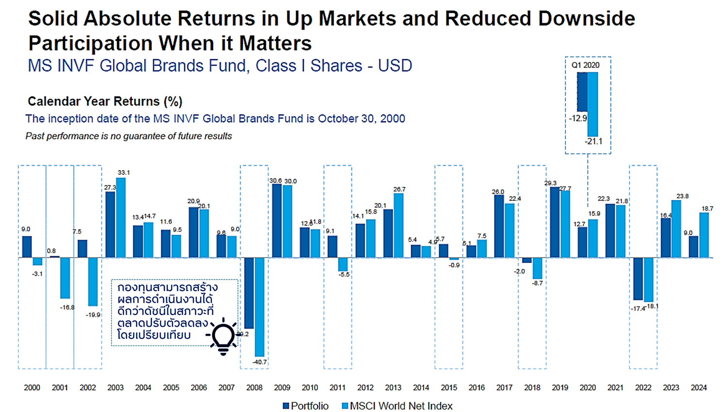 นับตั้งแต่จัดตั้งกองทุนในปี 2543 Morgan Stanley Investment Fund - Global Brands Fund มีผลการดำเนินงานที่ดีอย่างต่อเนื่องโดยติดลบเพียง 3 ปีจาก 23 ปีปฏิทินเท่านั้น