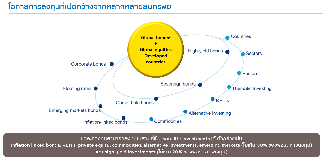 1. กรอบการลงทุนที่ยืดหยุ่นในหลากหลายสินทรัพย์ทั่วโลก เพื่อตอบโจทย์ทุกโอกาสการลงทุน และมีความยืดหยุ่นในการปรับพอร์ทที่สูงและเร็ว แบ่งสัดส่วนเป็น Core และ Satellite Portfolio