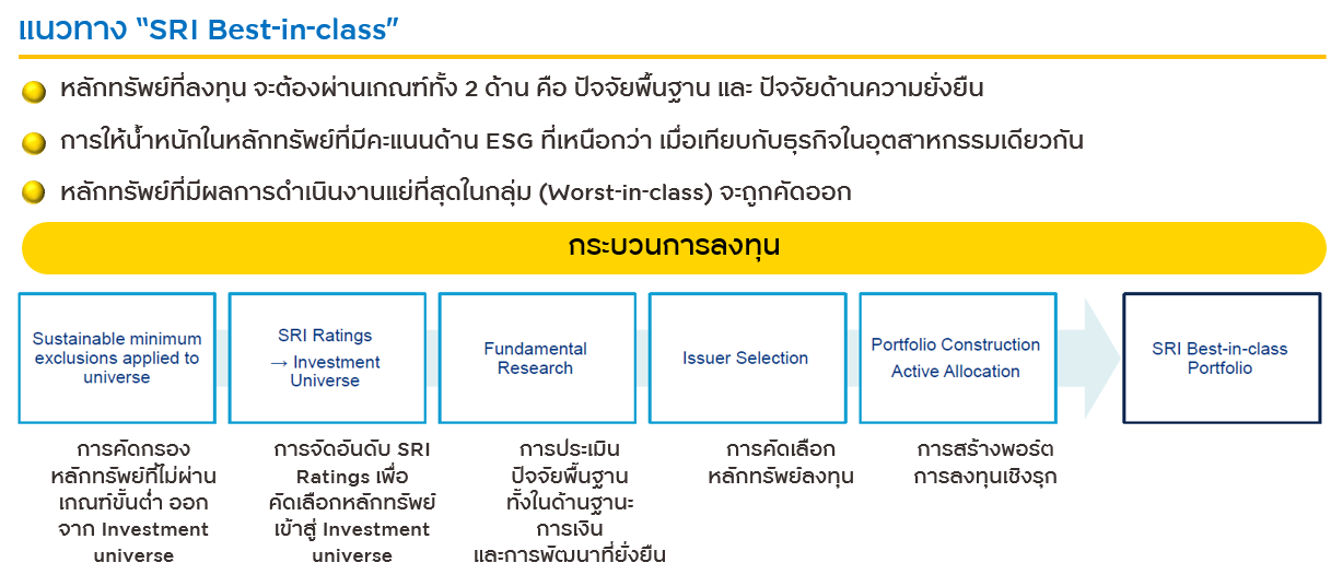 2. เสริมความแข็งแกร่งให้พอร์ตด้วยการใช้แนวทาง SRI Best-in-class เข้ามาพิจารณาตลอดทั้งกระบวนการลงทุน ผสานด้วย 3 หัวใจสำคัญสู่การสร้างพอร์ตลงทุนที่แตกต่าง