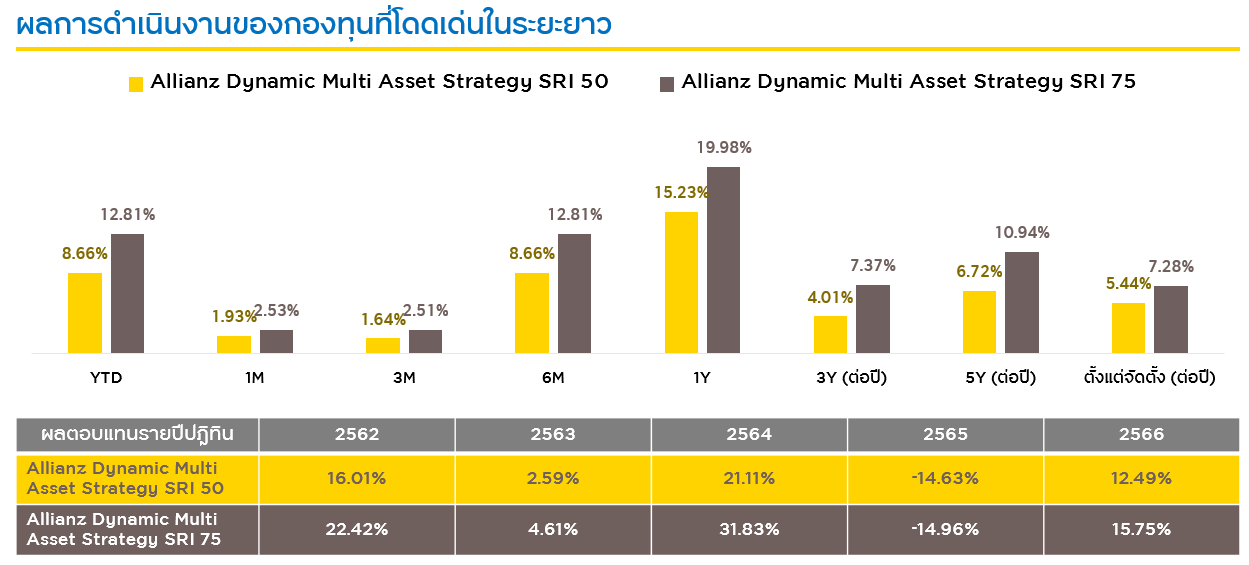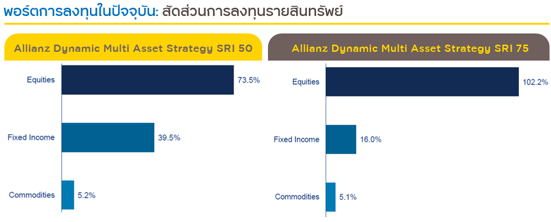 ที่มา: Allianz Global Investors ณ พ.ค. 67 | ไม่มีการรับประกันผลตอบแทนของกลยุทธ์การลงทุนนี้ โดยกลยุทธ์การลงทุนอาจมีโอกาสขาดทุนได้ | ทีมผู้จัดการกองทุนจะมีการทบทวนสัดส่วนการลงทุนและระดับความผันผวนคาดการณ์เป็นรายปี | *สัดส่วนการลงทุนในหุ้นของกองทุน Allianz Dynamic Multi Asset Strategy SRI 75 อาจเพิ่มได้สูงสุดถึง 125% โดยการใช้ตราสารอนุพันธ์ | ผลการดำเนินงานที่แสดงเป็นผลการดำเนินงานของกองทุนหลัก ซึ่งไม่ได้เป็นไปตามมาตรฐานการวัดผลการดำเนินงานของกองทุนรวมของสมาคมบริษัทจัดการลงทุน