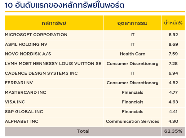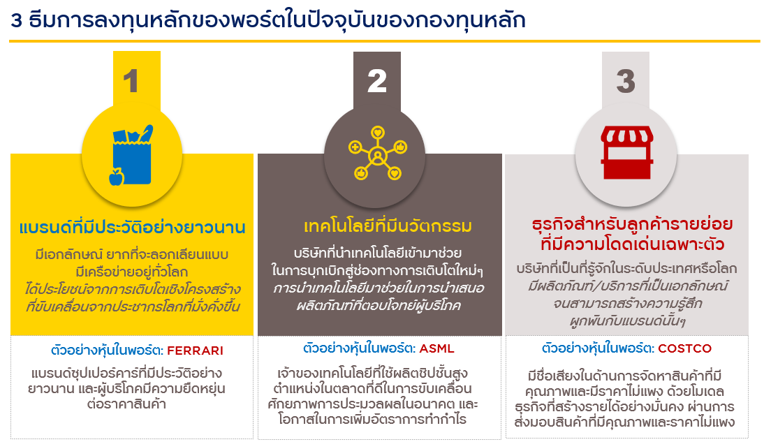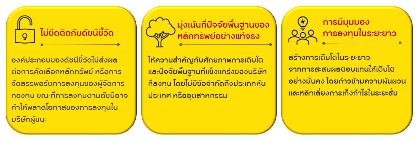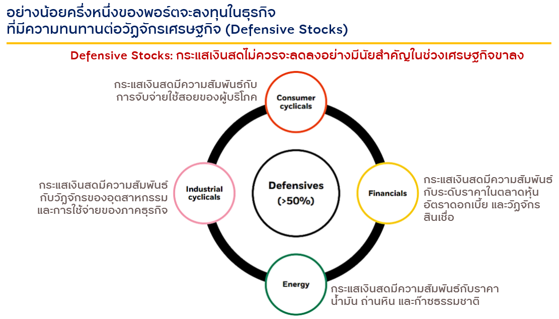 - >50% ของพอร์ตจะลงทุนในธุรกิจที่มีความทนทานต่อวัฏจักรเศรษฐกิจ เพื่อสร้างเกราะป้องกันให้พอร์ตในช่วงเศรษฐกิจขาลง