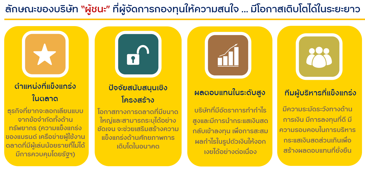 1. ให้ความสำคัญกับพื้นฐานที่แข็งแกร่งและศักยภาพการเติบโตของบริษัทที่ลงทุน โดยจะเฟ้นหาบริษัทที่มีลักษณะเป็น “ผู้ชนะ” ในตลาด และบริษัทที่มีศักยภาพมากที่สุด