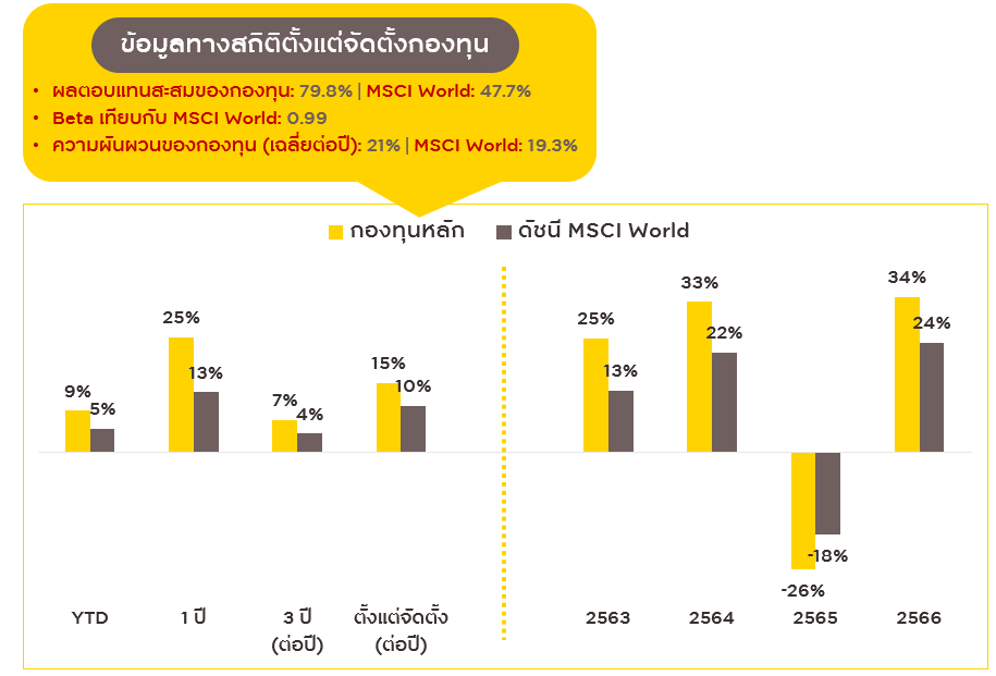 ที่มา: BlackRock ณ 29 ก.พ. 67 | ผลตอบแทนของดัชนีไม่ได้สะท้อนถึงค่าธรรมเนียมการจัดการ, ต้นทุนการทำธุรกรรมหรือค่าใช้จ่ายต่างๆ | กองทุนจัดตั้งขึ้นในวันที่ 21 ม.ค. 63 | ผลตอบแทนที่แสดงเป็นผลตอบแทนสุทธิหลังหักค่าธรรมเนียมที่เกี่ยวข้องของหน่วยลงทุนชนิด USD D accumulating | ผลการดำเนินงานที่แสดงเป็นผลการดำเนินงานของกองทุนหลัก ซึ่งไม่ได้เป็นไปตามมาตรฐานการวัดผลการดำเนินงานของ AIMC