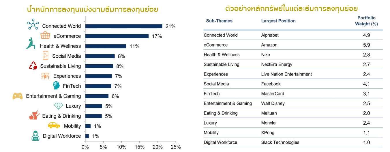 - เฟ้นหาบริษัทคุณภาพดี ราคาน่าดึงดูดบนธีมที่มีศักยภาพเติบโต ขับเคลื่อนด้วยกลุ่ม Millennials เพื่อโอกาสสร้างผลตอบแทนที่ดี เช่น การเชื่อมต่อและสื่อสารบนโลกอินเทอร์เน็ต, ธุรกิจ E-Commerce, การดูแลรักษาสุขภาพ, การท่องเที่ยว และ ความบันเทิง เป็นต้น