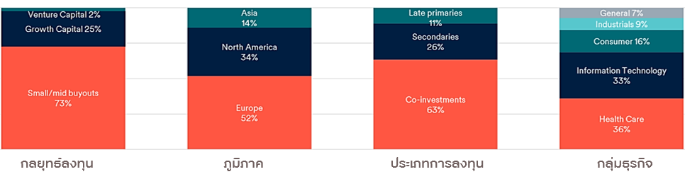 - Secondary fund investments: การลงทุนผ่าน Private equity fund ที่ซื้อขายในตลาดรองโดยเป็นการเข้าลงทุนต่อจากผู้ลงทุนรายอื่นที่ต้องการขายเงินลงทุนก่อนสิ้นสุดอายุโครงการ