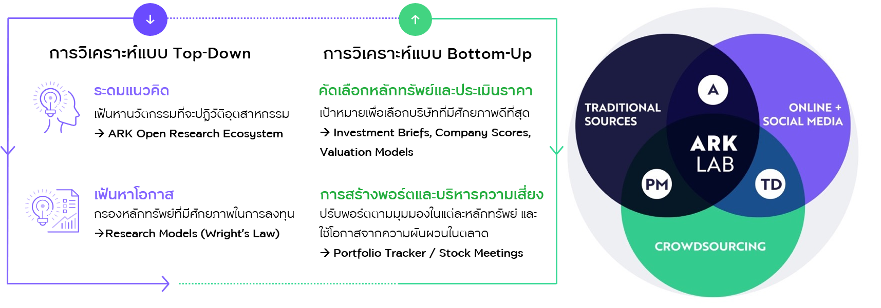3.   กลยุทธ์ลงทุนเฉพาะตัวที่ใช้การวิเคราห์ข้อมูลผสมผสาน Top-down และ Bottom-up และแหล่งข้อมูลที่แตกต่าง เพื่อฐานข้อมูลเชิงลึกที่ทันต่อสถานการณ์ ผสานข้อมูลจากแหล่งข้อมูลแบบดั้งเดิม สื่อออนไลน์ และ   Social  Media    เพื่อหาโอกาสการลงทุนตามธีมนวัตกรรมต่างๆ ในหลากหลายอุตสาหกรรม รวมถึงการจัดสรรน้ำหนักการลงทุนตาม 5 นวัตกรรมหลักได้อย่างลงตัว