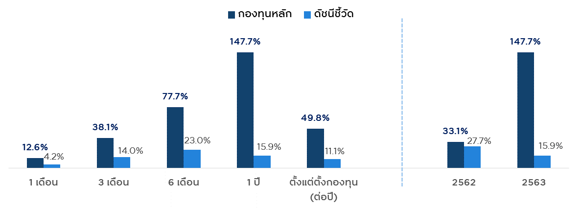 ที่มา: Nikko AM ณ 31 ธ.ค. 63 | กองทุนจัดตั้งขึ้นเมื่อ 29 ส.ค. 61 | ดัชนีชี้วัด คือ MSCI World Net Return USD Index โดยเป็นเพียงดัชนีชี้วัดเพื่อการเปรียบเทียบ ซึ่งไม่ได้เป็นดัชนีชี้วัดอย่างเป็นทางการของกองทุน | ผลการดำเนินงานที่แสดงเป็นผลการดำเนินงานของกองทุนหลัก ซึ่งไม่ได้เป็นไปตามมาตรฐานการวัดผลการดำเนินงานของกองทุนรวมของ AIMC