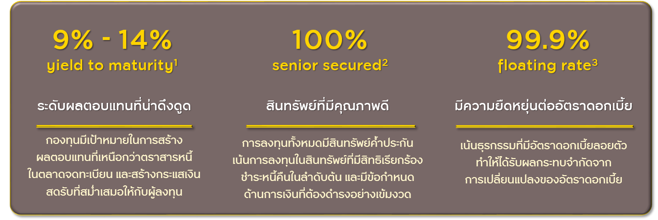 - กองทุนมีเป้าหมายในการสร้างผลตอบแทนที่เหนือกว่าตราสารหนี้ในตลาดจดทะเบียน และสร้างกระแสเงินสดรับที่สม่ำเสมอให้กับผู้ลงทุน