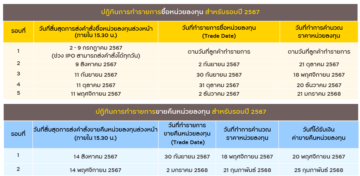 - ในการส่งคำสั่งซื้อหน่วยลงทุน ผู้ลงทุนต้องส่งคำสั่งรายการซื้อหน่วยลงทุน พร้อมทั้งชำระเงินค่าซื้อหน่วยลงทุนล่วงหน้าก่อนวันทำรายการในแต่ละรอบโดยให้เป็นไปตามประกาศวันทำการซื้อขายหน่วยลงทุนที่บริษัทจัดการกำหนด และผู้ลงทุนจะไม่สามารถยกเลิกการทำรายการดังกล่าวได้ โดยคำสั่งซื้อจะถูกนำมาดำเนินการในวันสุดท้ายของแต่ละเดือน (Trade date) และจะได้รับการจัดสรรหน่วยลงทุนเมื่อกองทุนได้มีการคำนวณมูลค่าทรัพย์สินสุทธิต่อหน่วยของรอบนั้น ซึ่งจะคำนวณและประกาศภายใน 62 วันทำการถัดจากวันทำการสุดท้ายของเดือนหรืออาจเกินกว่านั้นขึ้นอยู่กับกองทุนหลักและกองทุนอ้างอิง ดังนั้น ในช่วงระยะเวลาระหว่างที่ผู้ลงทุนส่งคำสั่งซื้อพร้อมชำระเงินค่าซื้อหน่วยลงทุนล่วงหน้าจนถึงก่อนการคำนวณมูลทรัพย์สินสุทธิต่อหน่วย ผู้ลงทุนจะยังไม่ได้รับการจัดสรรหน่วยลงทุนเพิ่มขึ้นจนกว่าจะมีการคำนวณและประกาศมูลค่าทรัพย์สินสุทธิต่อหน่วยเสร็จสิ้นแล้ว