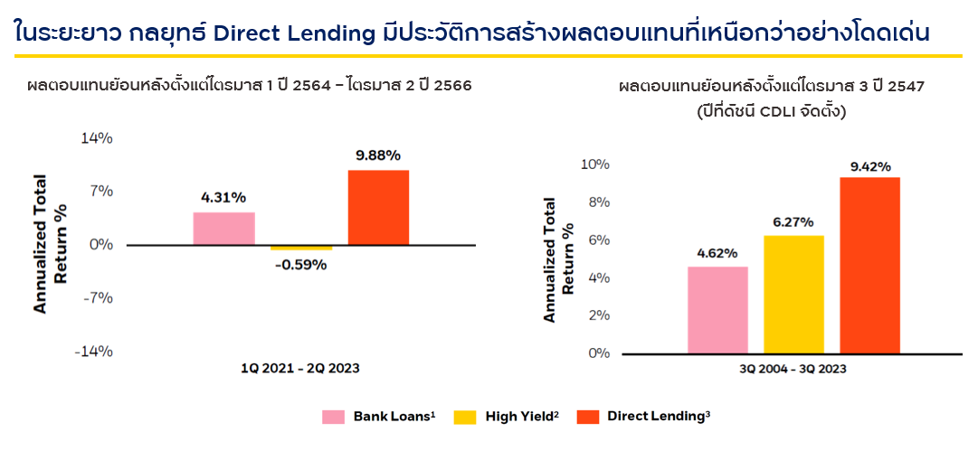 ที่มา: Morningstar, Cliffwater Direct Lending Index, St. Louis Fed, Blackrock ณ 30 ก.ย. 66 | ผลการดำเนินงานที่แสดงเพื่อใช้ประกอบการอธิบายเท่านั้น และไม่ได้สะท้อนถึงค่าธรรมเนียมหรือค่าใช้จ่ายต่างๆที่เกี่ยวข้อง | ช่วงเวลาที่ถูกเลือกในภาพซ้ายมีวัตถุประสงค์เพื่อแสดงผลการดำเนินงานหลังจากความผันผวนในช่วง Covid | 1 - Bank Loans อ้างอิงจาก the S&P/LSTA Leveraged Loan Total Return Index | 2 - High Yield อ้างอิงจาก the Bloomberg US Corporate High Yield Total Return Index | 3 - Direct Lending อ้างอิงจาก the Cliffwater Direct Lending Index | วันจัดตั้งของดัชนี Cliffwater Direct Lending Index คือ 30 ก.ย. 47
