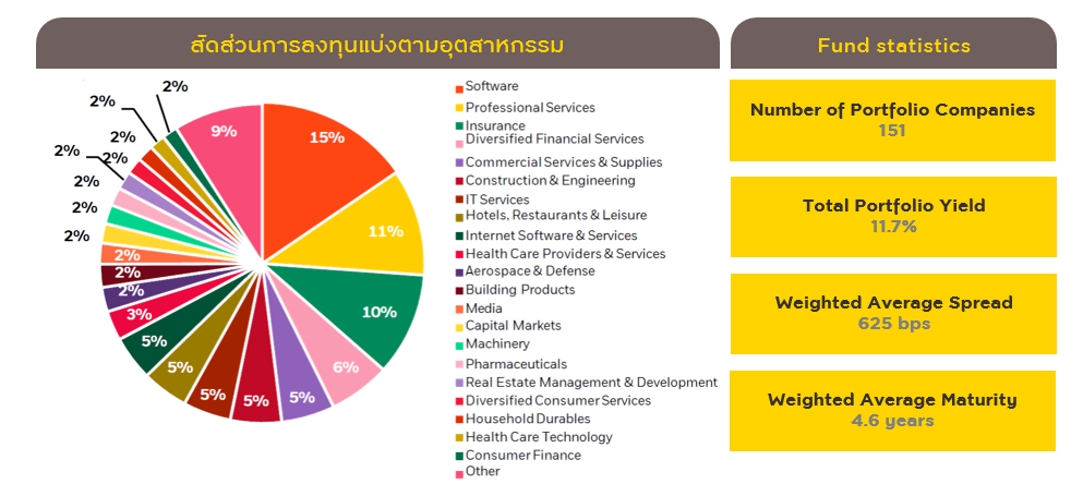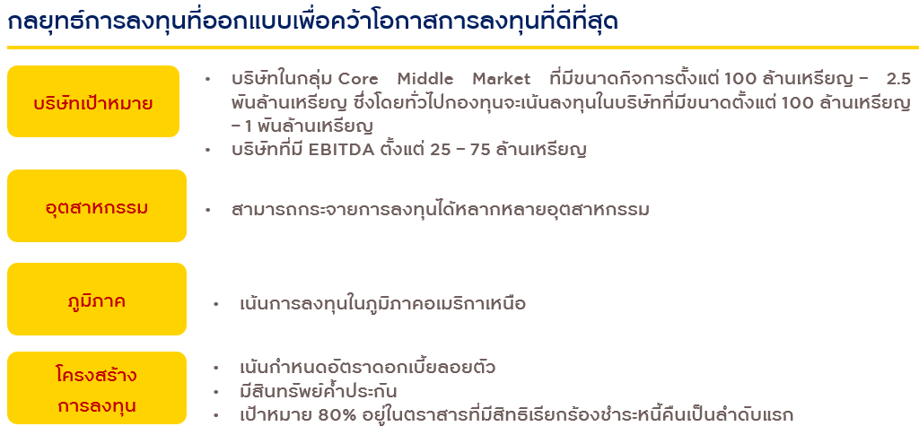 - กระจายการลงทุนในหลากหลายบริษัทและอุตสาหกรรม โดยเน้นลงทุนในอุตสาหกรรมที่ (1) ไม่ใช่วัฏจักร (Non-cyclical) คือบริษัทที่มีแนวโน้มจะดำเนินธุรกิจได้ดีโดยได้รับผลกระทบในระดับต่ำจากการเปลี่ยนแปลงของวัฏจักรเศรษฐกิจ (2) มีรายได้สม่ำเสมอ (Recurring Earnings) โดยเน้นการลงทุนในดีลที่มีสินทรัพย์ค้ำประกัน และมีสิทธิในการเรียกร้องเป็นลำดับแรก