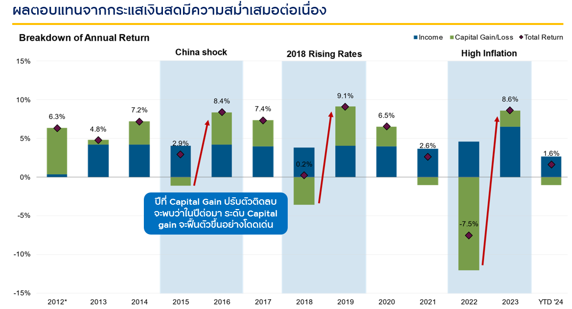 2. มุ่งเน้นกระแสเงินสดจากการลงทุน เป็นตัวขับเคลื่อนผลตอบแทนโดยรวมและช่วยชดเชยความเสี่ยงขาลงเมื่อราคาตราสารหนี้ที่ลงทุนลดลง