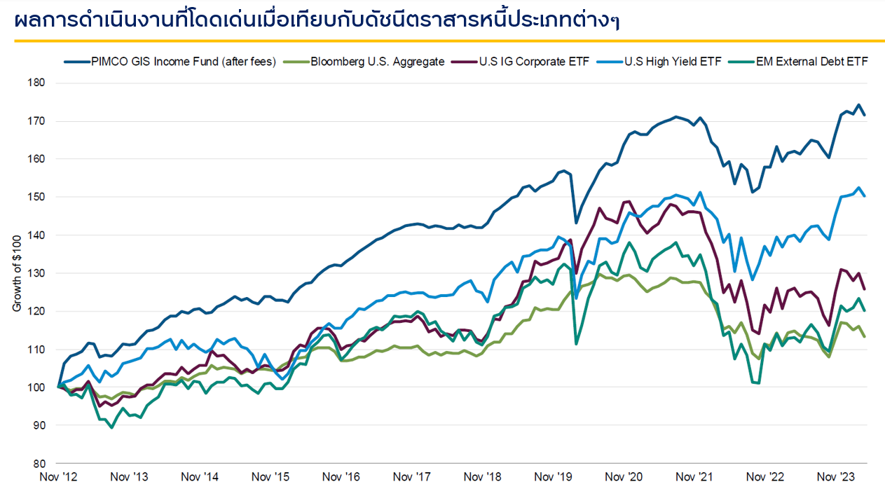 ที่มา: PIMCO, Bloomberg ณ 30 เม.ย. 2567 | จุดเริ่มต้นวัดจากวันจัดตั้งกองทุน PIMCO GIS Income Fund ซึ่งจัดตั้งขึ้นเมื่อ 30 พ.ย. 55 | ดัชนีและ ETF ที่ใช้เป็นตัวแทนอ้างอิง คือ U.S Agg = Bloomberg U.S. Aggregate Index, U.S High Yield ETF = iSharesiBoxx$ High Yield Corporate Bond ETF, U.S IG Corporate ETF = iSharesiBoxx$ Investment Grade Corporate Bond ETF | ผลการดำเนินงานที่แสดงเป็นผลการดำเนินงานหลังหักค่าธรรมเนียมการจัดการและคิดเป็นรูปสกุลเงิน USD | ผลการดำเนินงานที่แสดงเป็นผลการดำเนินงานของกองทุนหลักซึ่งไม่ได้เป็นไปตามมาตรฐานการวัดผลการดำเนินงานของกองทุนรวมของ AIMC