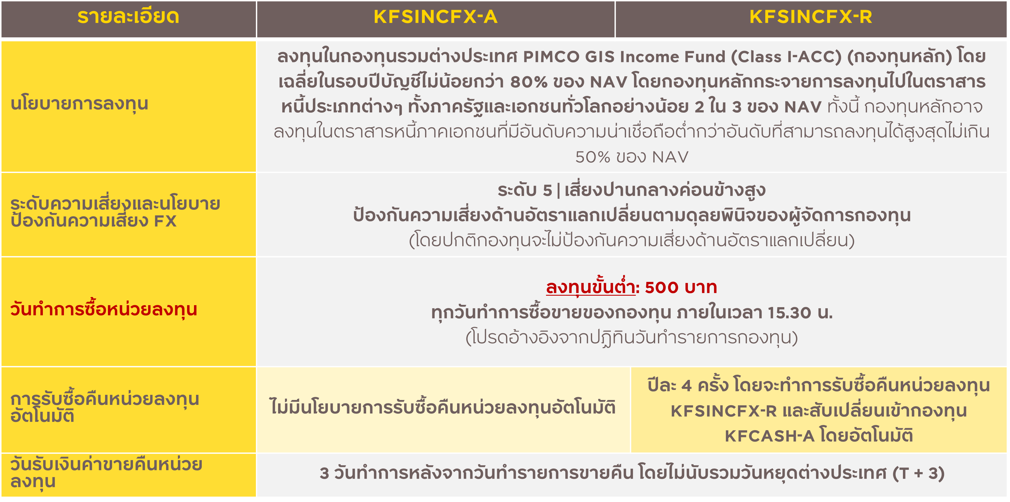 - สำหรับ KF-SINCOME และ KFSINCFX-R การจ่ายผลตอบแทนขึ้นอยู่กับผลการดำเนินงานของกองทุนหลัก ซึ่งอาจมีโอกาสที่นักลงทุนจะไม่ได้รับผลตอบแทนในบางช่วงเวลา