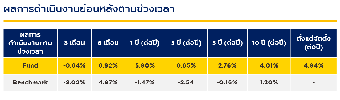 ที่มา: Bloomberg, PIMCO ณ 31 พ.ค. 2567 | *ผลการดำเนินงานที่แสดงเป็นผลการดำเนินงานตั้งแต่จัดตั้งกองทุนเมื่อ 30 พ.ย. 55 | ผลการดำเนินงานที่แสดงเป็นผลการดำเนินงานของคลาสสำหรับลูกค้าประเภทสถาบัน ในหน่วยลงทุนชนิดสะสมมูลค่า โดยเป็นผลการดำเนินงานสุทธิหลังหักค่าธรรมเนียม | ผลการดำเนินงานที่น้อยกว่า 1 ปี เป็นผลการดำเนินงานสะสมตามช่วงเวลา | ผลการดำเนินงานที่แสดงเป็นผลการดำเนินงานของกองทุนหลัก ซึ่งไม่ได้เป็นไปตามมาตรฐานการวัดผลการดำเนินงานของกองทุนรวมของ AIMC