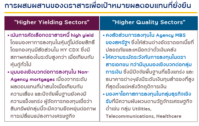 - มุ่งเน้นรายได้ที่สม่ำเสมอจากการลงทุน โดยมีแหล่งรายได้หลากหลายจากการกระจายการลงทุนในตราสารหนี้หลายประเภททั่วโลก ผสมผสานระหว่างตราสารที่มีคุณภาพสูงกับตราสารที่ให้ผลตอบแทนสูง ทั้งตราสารหนี้ภาครัฐ หุ้นกู้เอกชน Investment Grade และ High yield รวมถึงตราสารหนี้ที่มีอสังหาค้ำประกัน (MBS) /สินทรัพย์ค้ำประกัน (ABS) เพื่อเพิ่มศักยภาพในการสร้างผลตอบแทนที่ดี ยั่งยืนและสม่ำเสมอ พร้อมช่วยลดความผันผวนจากการเปลี่ยนแปลงทางเศรษฐกิจและดอกเบี้ย