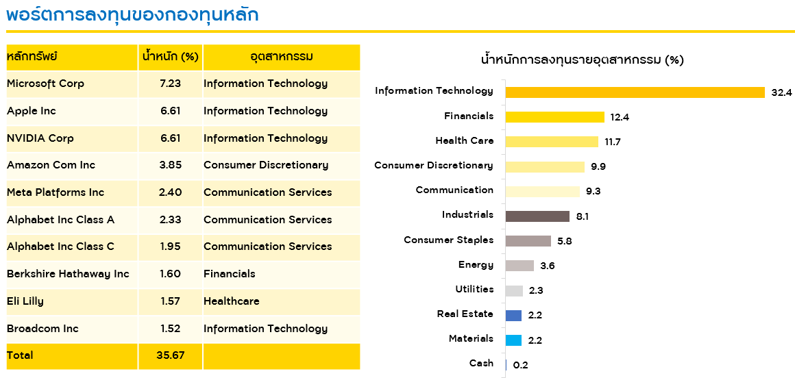 กองทุนลงทุนผ่านกองทุนหลัก “iShares Core S&P 500 ETF” ที่สามารถเข้าถึงบริษัท 500 อันดับแรกของสหรัฐได้ในกองทุนเดียว และมีค่าธรรมเนียมต่ำ พร้อมเน้นสร้างผลตอบแทนให้ใกล้เคียงกับดัชนี S&P 500 Index ซึ่งเป็นหนึ่งในดัชนีหลักของโลก