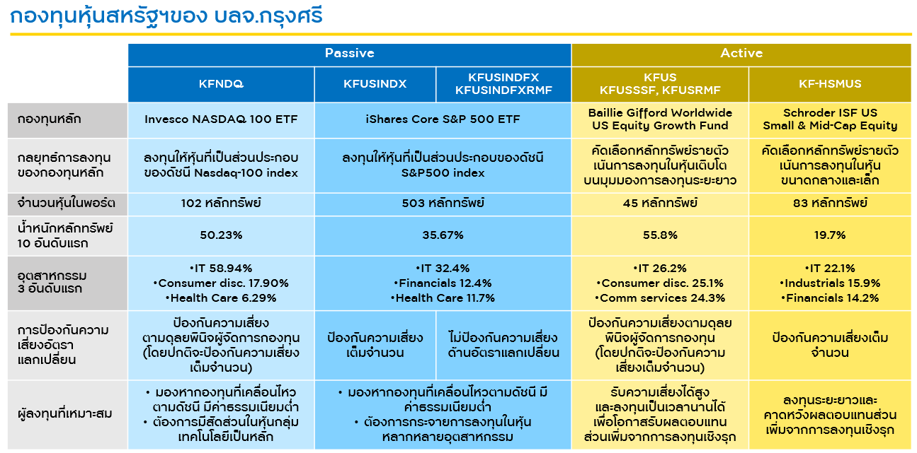 ข้อมูลกองทุน คลิก: KFNDQ-A | KF-HSMUS | KFUS-A | KFUSINDX-A | KFUSSSF | KFUSRMF