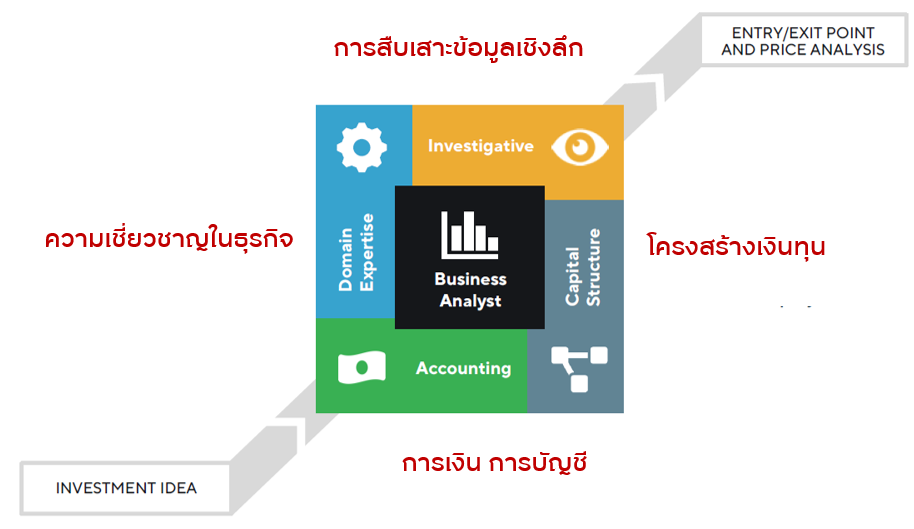 - การสืบเสาะข้อมูลเชิงลึก: ฝ่ายบริหารมีความโปร่งใสและซื่อสัตย์หรือไม่? / คู่แข่งคิดอย่างไรเกี่ยวกับบริษัทนี้? / มีจุดบอดใดที่นักวิเคราะห์วิเคราะห์แบบดั้งเดิมอาจมองข้ามหรือไม่?