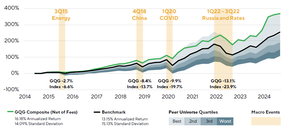 ที่มา: GQG Partners ณ 30 ก.ย. 67 | วันจัดตั้งกองทุน คือ 1 ก.ค. 57 | กองทุนที่นำมาเปรียบเทียบอ้างอิงจาก Morningstar Peer Universe ในกลุ่ม US Large Cap | ผลการดำเนินงานที่แสดงเป็นผลการดำเนินงานของกองทุนหลัก ซึ่งไม่ได้เป็นไปตามมาตรฐานการวัดผลการดำเนินงานของกองทุนรวมของสมาคมบริษัทจัดการลงทุน