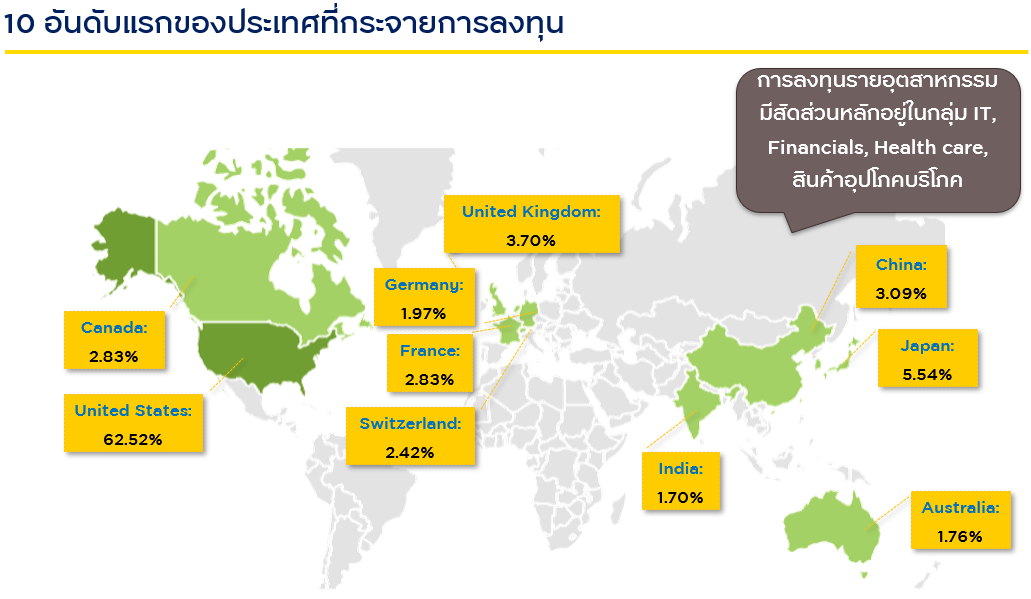 - ดัชนี MSCI ACWI Index มีกระจายน้ำหนักการลงทุนในหลากหลายอุตสาหกรรมและภูมิภาคทั่วโลก จึงไม่ผันผวนไปตามอุตสาหกรรมใดอุตสาหกรรมหนึ่งมากเกินไป
