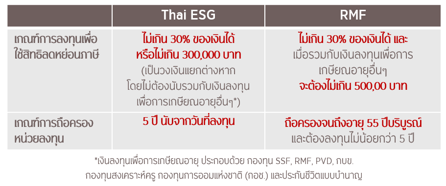 ต่อที่ 1 เงินลงทุนจะได้รับสิทธิ์ลดหย่อนภาษี ตามเกณฑ์ของ Thai ESG และ RMF