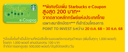- รับ Starbucks e-Coupon มูลค่ารวมสูงสุด 200 บาท สำหรับสมาชิกบัตรฯ ที่เปิดบัญชีกองทุนกับบลจ.กรุงศรี และทำการแลกคะแนนเพื่อซื้อหน่วยลงทุนของบลจ.กรุงศรี ระหว่างวันที่ 20 ต.ค. 68 – 30 ธ.ค. 68 (เฉพาะลูกค้าใหม่ที่ไม่มีบัญชีกับ บลจ.กรุงศรี มาก่อน), จำกัดการรับคูปอง 1 สิทธิ์/ท่าน/ตลอดรายการ