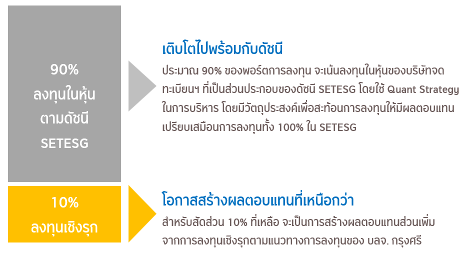 - โอกาสสร้างผลตอบแทนที่เหนือกว่าดัชนี ด้วยการกระจายสัดส่วนสำหรับการลงทุนเชิงรุก โดยประมาณ 90% ของพอร์ตการลงทุนจะเน้นลงทุนในหุ้นของบริษัทจดทะเบียนฯ ที่เป็นส่วนประกอบของดัชนี SETESG โดยใช้ Quant Strategy เพื่อสะท้อนการลงทุนให้มีผลตอบแทนเปรียบเสมือนการลงทุนทั้ง 100% ในดัชนี SETESG นอกจากนี้ กองทุนยังมีโอกาสสร้างผลตอบแทนส่วนเพิ่มจากการลงทุนเชิงรุกตามแนวทางการลงทุนของ บลจ. กรุงศรี ในสัดส่วน 10% ของพอร์ต (ที่มา: บลจ.กรุงศรี ณ ต.ค. 68)