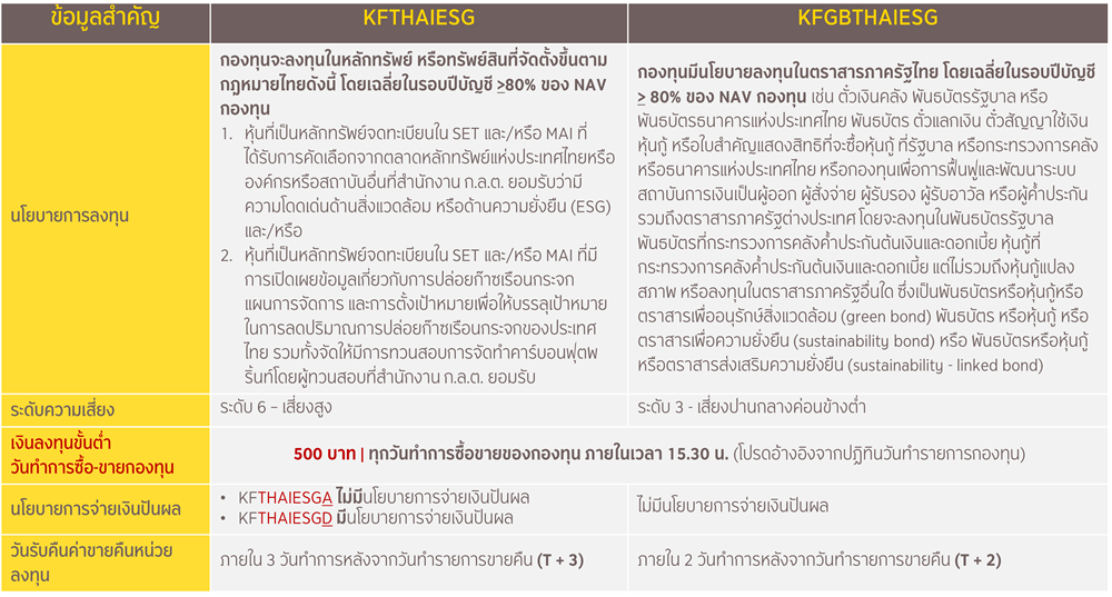 - KFTHAIESG มี 2 ชนิดหน่วยลงทุน คือ KFTHAIESGA (ชนิดสะสมมูลค่า - ไม่มีการจ่ายปันผล) และ KFTHAIESGD (ชนิดจ่ายปันผล)