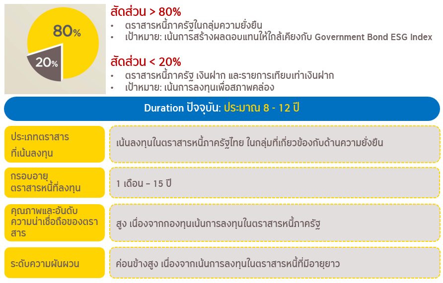 - เสริมสร้างความยั่งยืนให้กับพอร์ตและโลกด้วยการลงทุนในตราสารหนี้กลุ่มความยั่งยืนของภาครัฐ ซึ่งมีความน่าเชื่อถือสูง