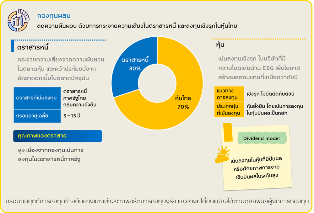 กองทุนผสม ที่เน้นกระจายความเสี่ยงและลดความผันผวน ด้วยการลงทุนในตราสารหนี้ 30% และลงทุนเชิงรุกในหุ้นไทย