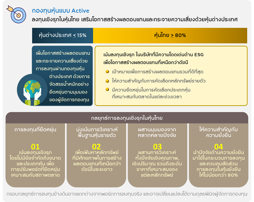 กองทุนหุ้นแบบ Active เน้นลงทุนเชิงรุกในหุ้นไทย พร้อมโอกาสสร้างผลตอบแทนและกระจายความเสี่ยงด้วยหุ้นต่างประเทศ