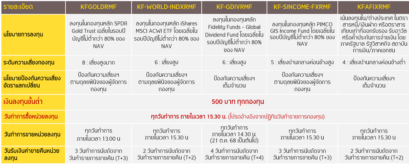 - สำหรับ KFGOLDRMF ผู้ลงทุนควรขอคำแนะนำเพิ่มเติมก่อนทำการลงทุน