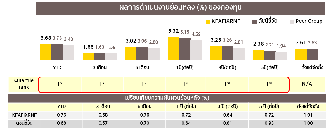 ที่มา: บลจ. กรุงศรี ณ 30 มิ.ย. 68 | ข้อมูล Quartile rank จาก Morningstar ในกลุ่ม Mid-term general bond | การจัดอันดับของ Morningstar ไม่มีความเกี่ยวข้องกับการจัดอันดับของสมาคมบริษัทจัดการกองทุนแต่อย่างใด | กองทุน KFAFIX-A จัดตั้งเมื่อ 21 ต.ค. 59 | ดัชนีชี้วัด คือ 1. ผลตอบแทนรวมสุทธิของดัชนีพันธบัตรรัฐบาลอายุ น้อยกว่าเท่ากับ 10 ปี ของสมาคมตลาดตราสารหนี้ไทย สัดส่วน (%): 50.00 2. ผลตอบแทนรวมสุทธิของดัชนีตราสารหนี้ภาคเอกชน Mark-to-market ที่มีอันดับความน่าเชื่อถือของผู้ออกตราสารอยู่ในระดับ BBB+ ขึ้นไป อายุ 1-3 ปี ของสมาคมตลาดตราสารหนี้ไทย สัดส่วน (%): 30.00 3. อัตราดอกเบี้ยเงินฝากประจำ 1 ปี วงเงินน้อยกว่า 5 ล้านบาท เฉลี่ยของ 3 ธนาคารพาณิชย์ขนาดใหญ่ ได้แก่ ธนาคารกรุงเทพ ธนาคารกสิกรไทย และธนาคารไทยพาณิชย์ หลังหักภาษี สัดส่วน (%):10.00 4.ดัชนีอัตราดอกเบี้ยอ้างอิง THOR หลังหักภาษี สัดส่วน (%): 10.00 | เริ่มใช้ดัชนีชี้วัดผลการดำเนินงานใหม่หลังหักภาษี (Net TRN Index) มีผลตั้งแต่วันที่ 31 ต.ค. 62 | Peer Group คือ ค่าเฉลี่ยในกลุ่มเดียวกันตามกลุ่ม Mid Term General Bond | ผลการดำเนินงานนี้ได้จัดทำขึ้นตามมาตรฐานการวัดผลการดำเนินงานของกองทุนรวมของ AIMC