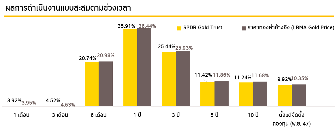 ที่มา: SPDR Gold Shares ณ 31 ส.ค. 68 | ผลการดำเนินงานคำนวณจากผลตอบแทนสุทธิหลังหักค่าธรรมเนียม (NAV ต่อ NAV) ในสกุลเงินดอลลาร์สหรัฐฯ | ผลการดำเนินงานที่แสดงเป็นผลการดำเนินงานของกองทุนหลัก ซึ่งไม่ได้เป็นไปตามมาตรฐานการวัดผลการดำเนินงานของกองทุนรวมของ AIMC