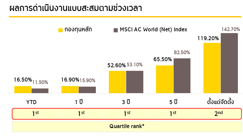 ที่มา: iShares ณ 30 ก.ย. 68 | วันจัดตั้งกองทุน คือ 26 มี.ค. 51 | ดัชนี คือ MSCI ACWI Index | ผลการดำเนินงานของกองทุนหลักอ้างอิงจากราคา NAV รวมผลตอบแทนจากเงินปันผล | ผลการดำเนินงานที่แสดงเป็นผลการดำเนินงานของกองทุนหลัก ซึ่งไม่ได้เป็นไปตามมาตรฐานการวัดผลการดำเนินงานของกองทุนรวมของสมาคมบริษัทจัดการลงทุน