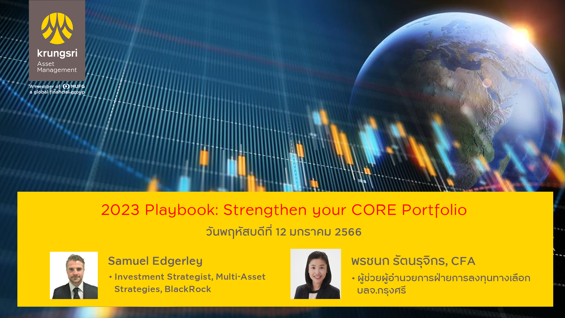 รับฟังมุมมองการลงทุนจากผู้จัดการกองทุนกรุงศรี จัดเต็มครั้งเดียวในรอบปี อัปเดตเศรษฐกิจรอบโลก วิเคราะห์เจาะลึกการประชุม Fed ส่งสัญญาณอะไรบ้าง ปัจจัยหนุนและปัจจัยกดดัน พร้อมทางเลือกการลงทุนฝ่าความผันผวนทั้งตราสารหนี้ หุ้นไทย หุ้นต่างประเทศ สินทรัพย์ไหนที่น่าสนใจ ภูมิภาคไหน ประเทศไหนน่าลงทุน เทรนด์ธุรกิจไหนจะโต กลยุทธ์ลงทุนแบบไหนจะสร้างกำไร