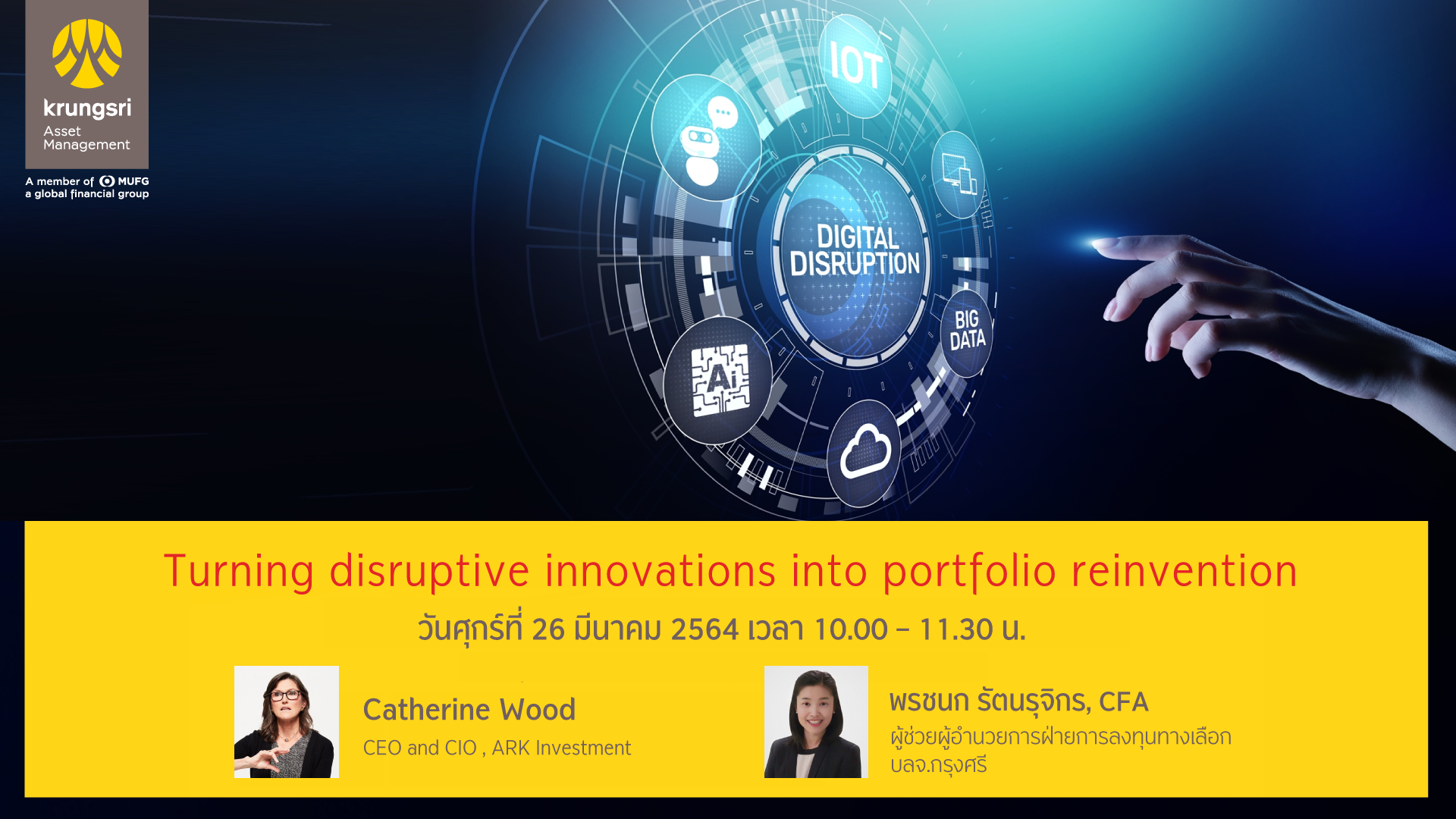 โอกาสพลิกพอร์ตการลงทุนของคุณ ด้วย 5 นวัตกรรมพลิกโลก ผ่านการลงทุนสไตล์ ARK Investment ผู้ปฎิวัติโลกการลงทุน รับฟังข้อมูลจาก Catherine Wood ผู้จัดการกองทุนแห่งยุค ที่มีรูปแบบและวิธีคัดเลือกหุ้นที่แตกต่าง สร้างจุดแข็งที่ยากจะลอกเลียนแบบ และผลตอบแทนที่โดดเด่นจากธีมการลงทุนแห่งอนาคตที่คุณไม่ควรพลาด